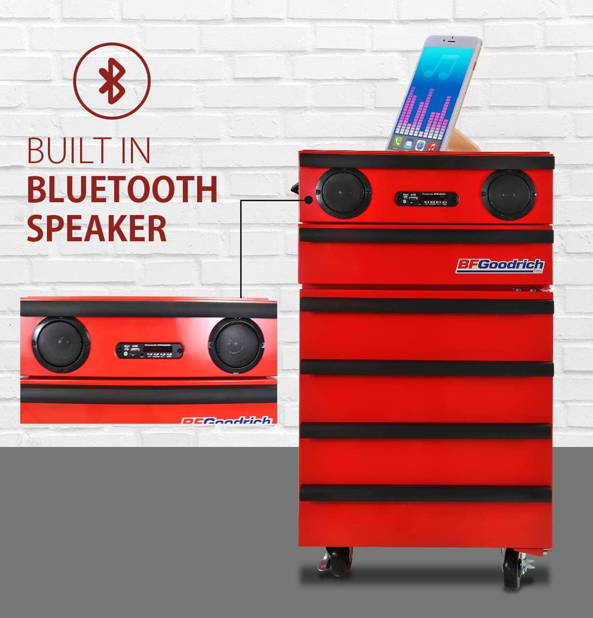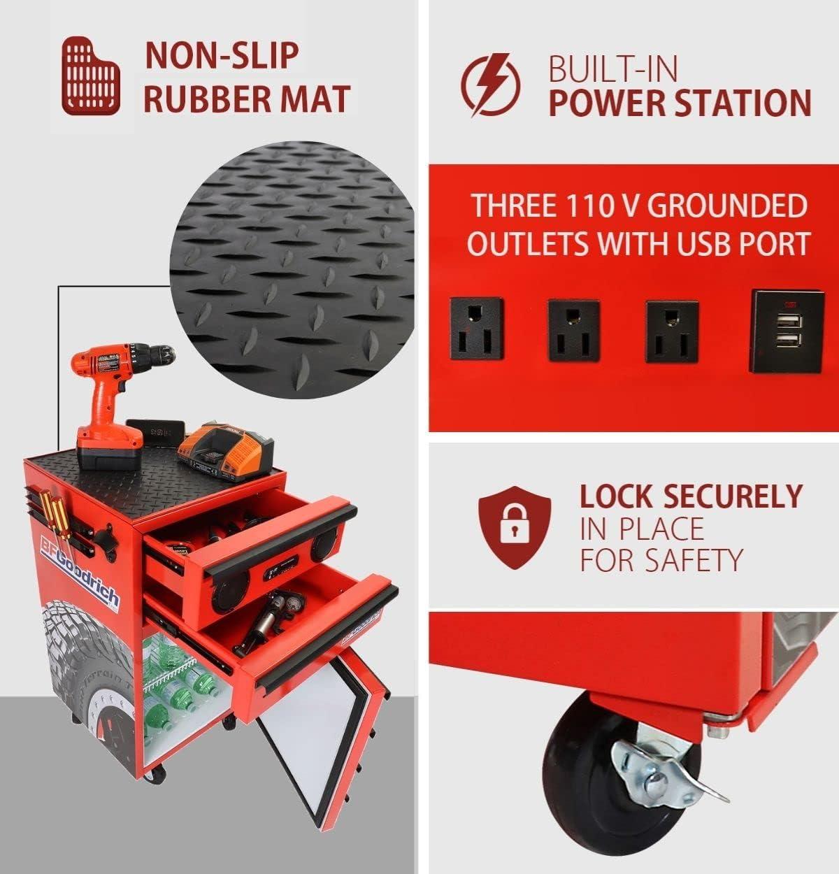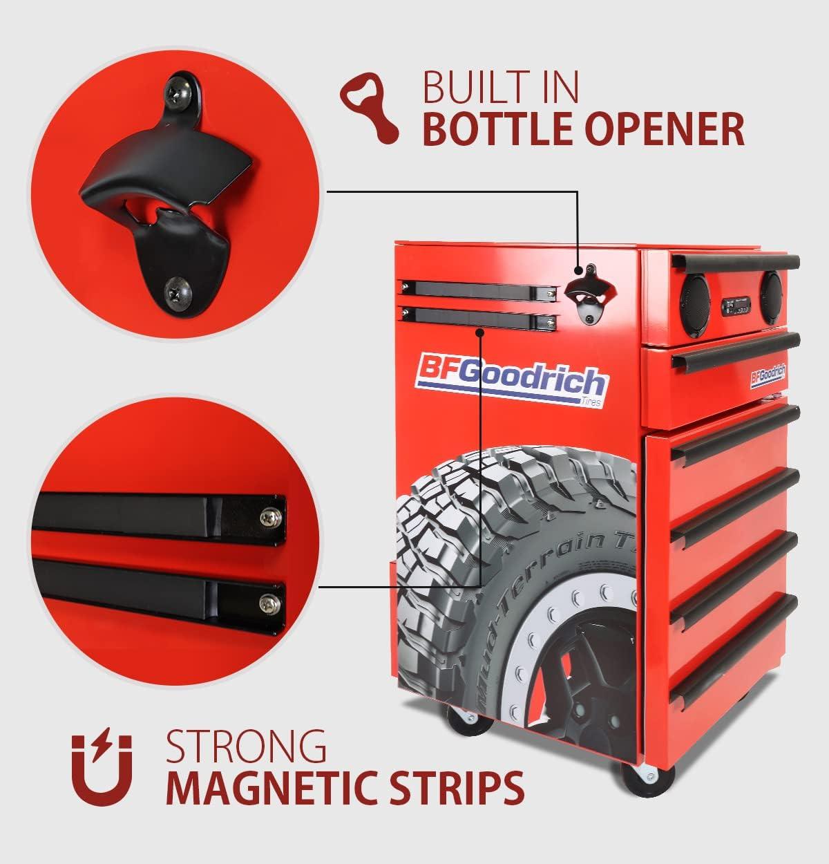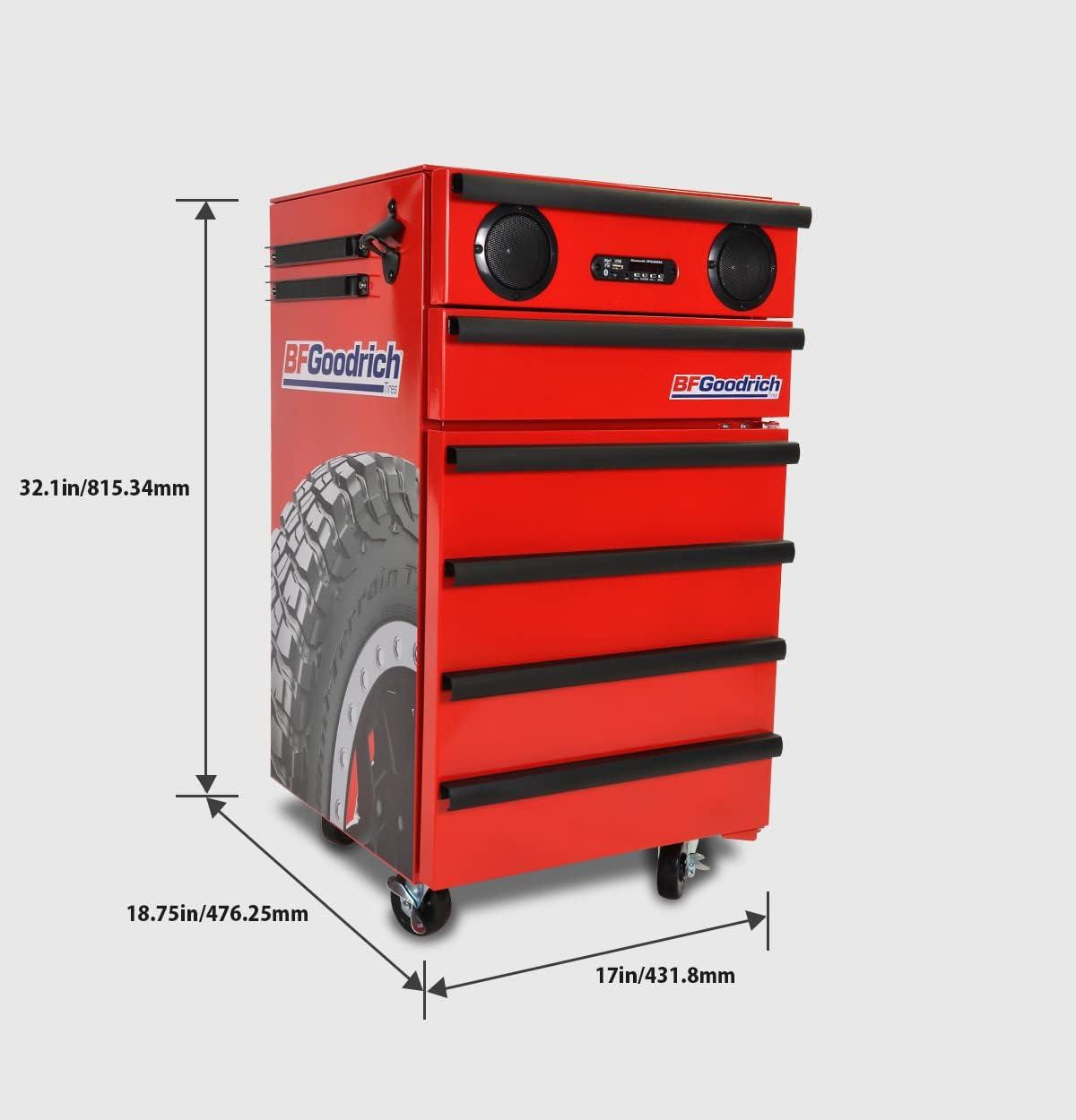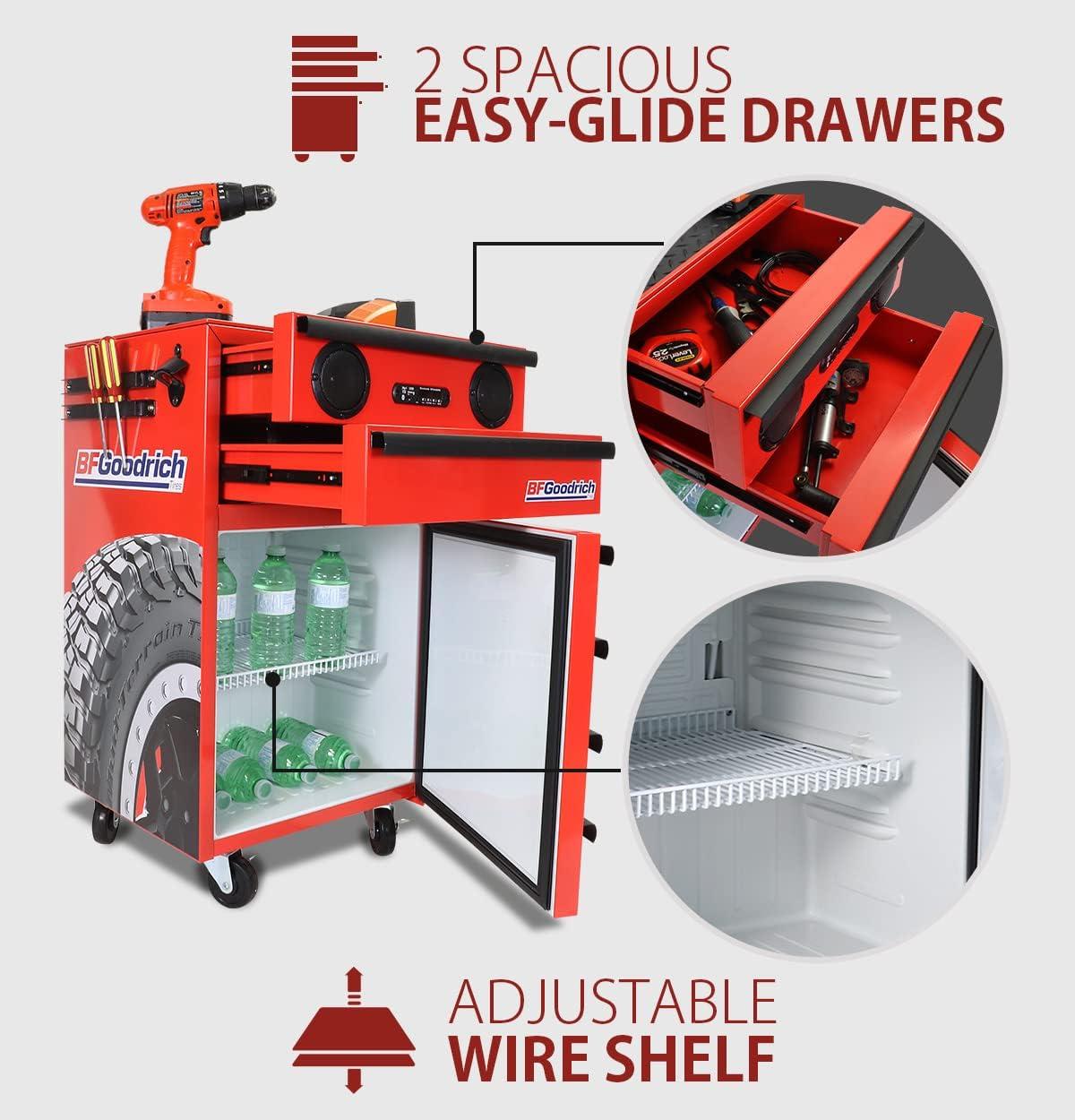 Unique versatile addition to your workshop Everything you need for work and play is right at your fingertips! Safely organize and store your tools between a non-slip rubber mat, strong magnetic strips, and two spacious, easy-glide drawers and plug into the convenient power station. Then play your favourite music on built-in wireless speakers and enjoy snacks and cold beverages from the spacious 1.8 cubic foot (50 L) compact refrigerator. Show off your unique style The eye-catching red finish with official BFGoodrich® artwork is sure to be a favourite of collectors and automotive enthusiasts, making this unit an amazing gift or the perfect addition to any garage, service area, or shop floor. Convenient and reliable This compact 50 L/ 52 Quart compact fridge uses efficient compressor technology to keep contents at your desired temperature between 32°F (0°C) and 50°F (10°C) and magnetic door seal keeps the cold inside where it belongs. Heavy-duty 3” swivel castors let you easily wheel the unit wherever you need it and lock securely in place for safety.
