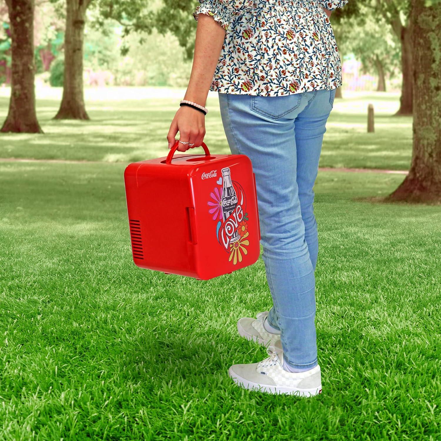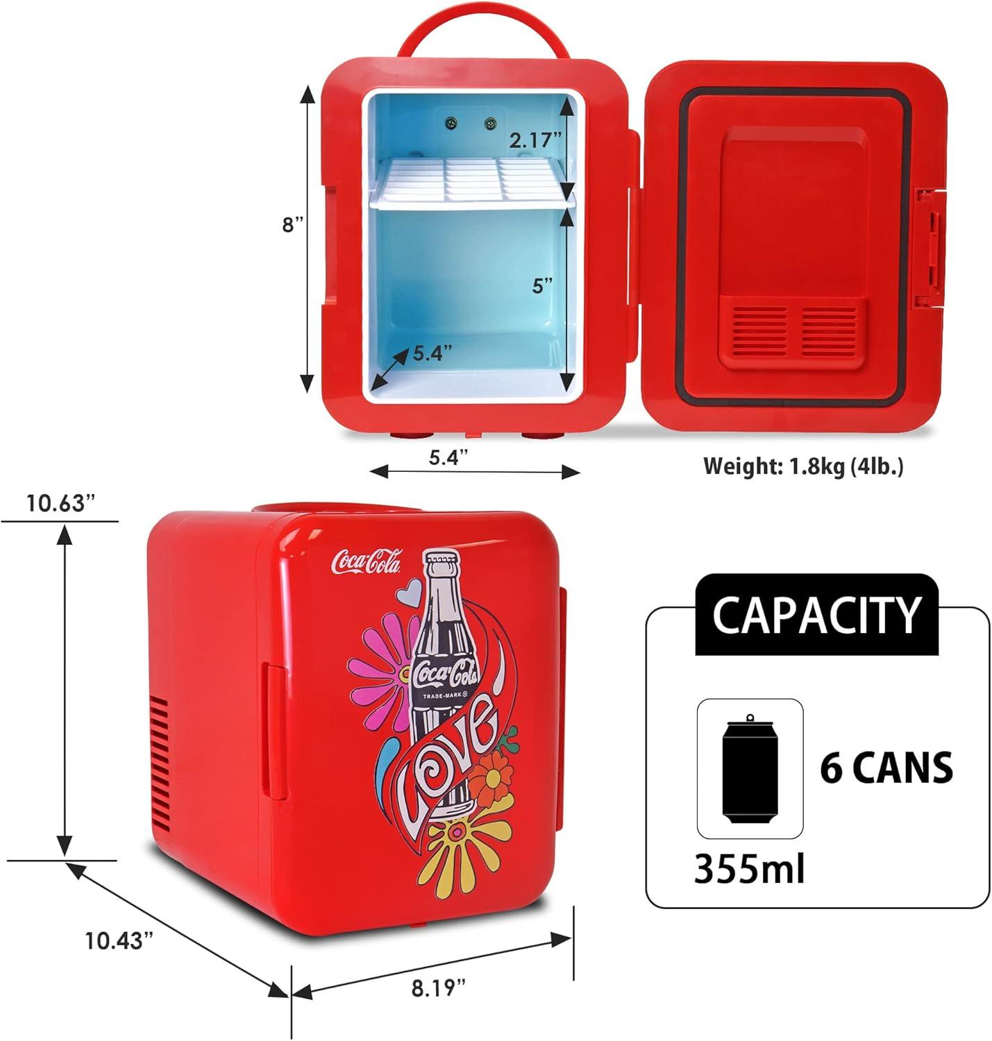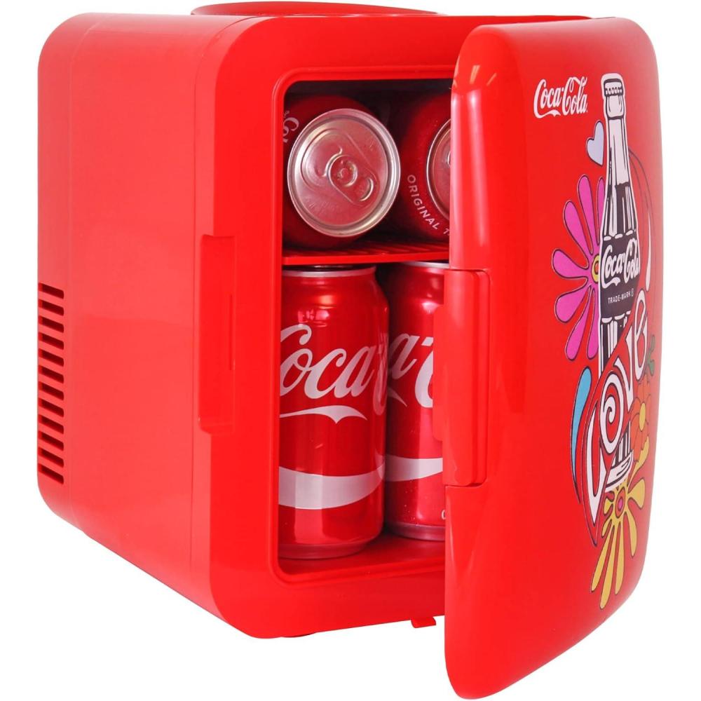 JOIN THE CELEBRATION : This personal mini fridge with rounded retro refrigerator silhouette, official Coca-Cola graphics and groovy 1970s style text celebrates the 50th anniversary of the iconic “I’d like to buy the world a Coke!” ad