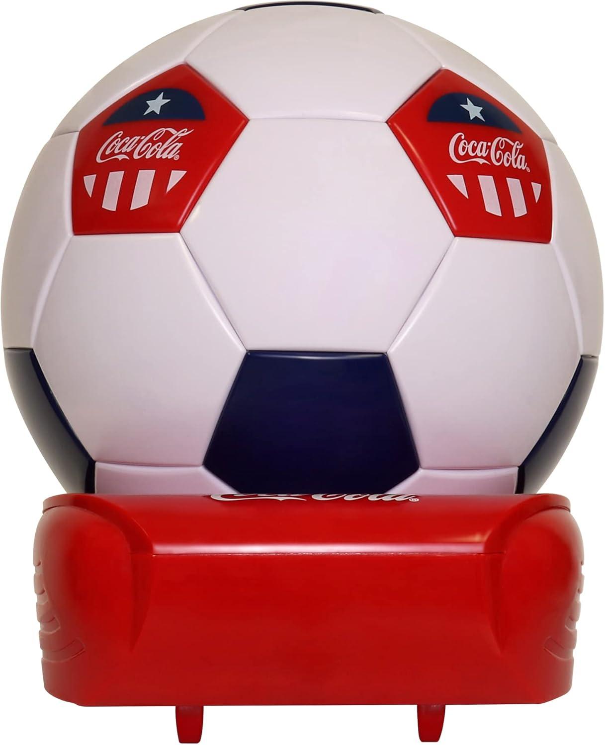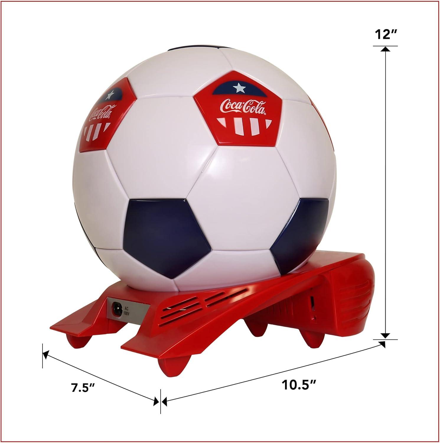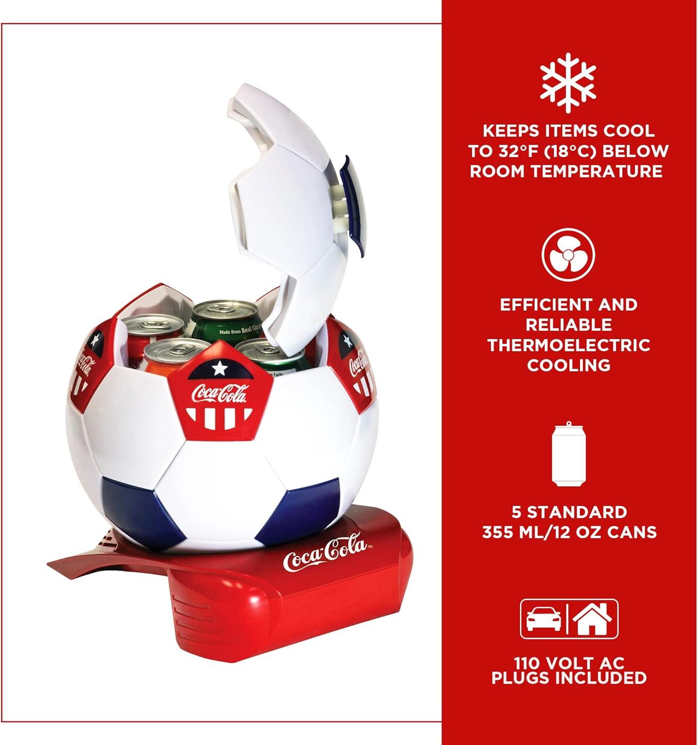 Coca-Cola Soccer Ball Mini Fridge, 5 Can Beverage Cooler with Hidden Opening, White Red Black, Unique Accessory for Den, Games Room, Man-Cave, Dorm, Sports Fans, Students