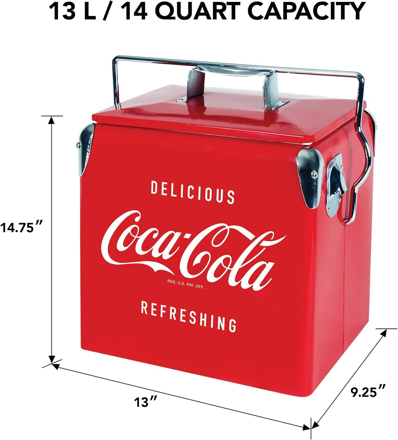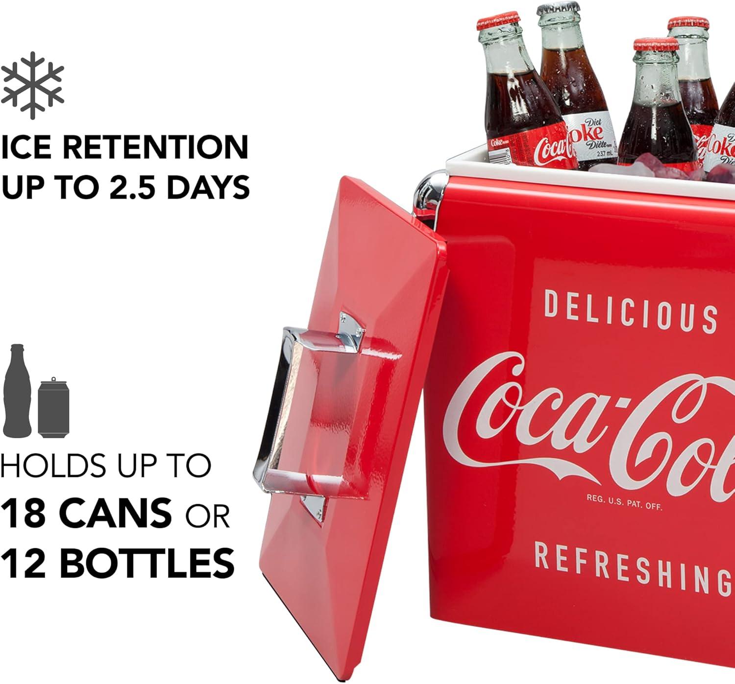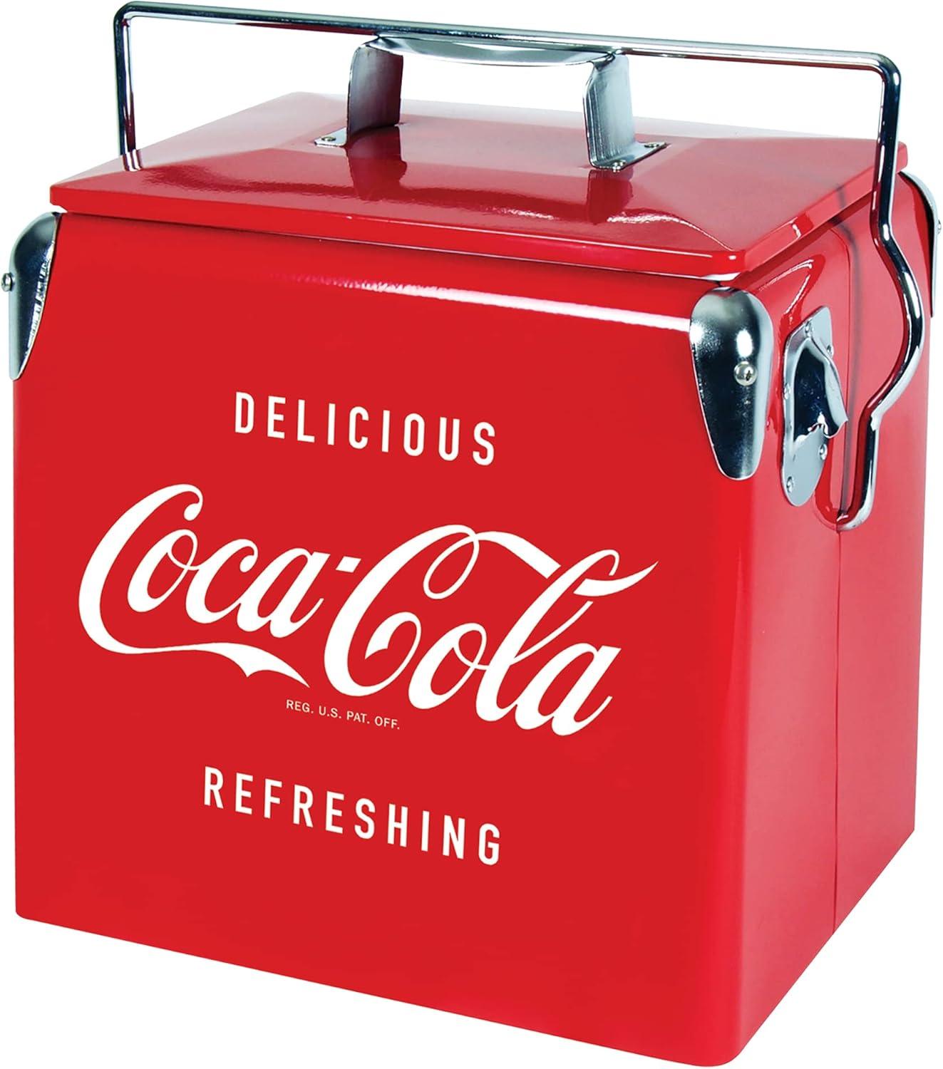 Its retro design, steel-belted build, and vintage Coca-Cola branding add charm, while insulation, a self-locking lid, and built-in opener ensure convenience and cold drinks without electricity.