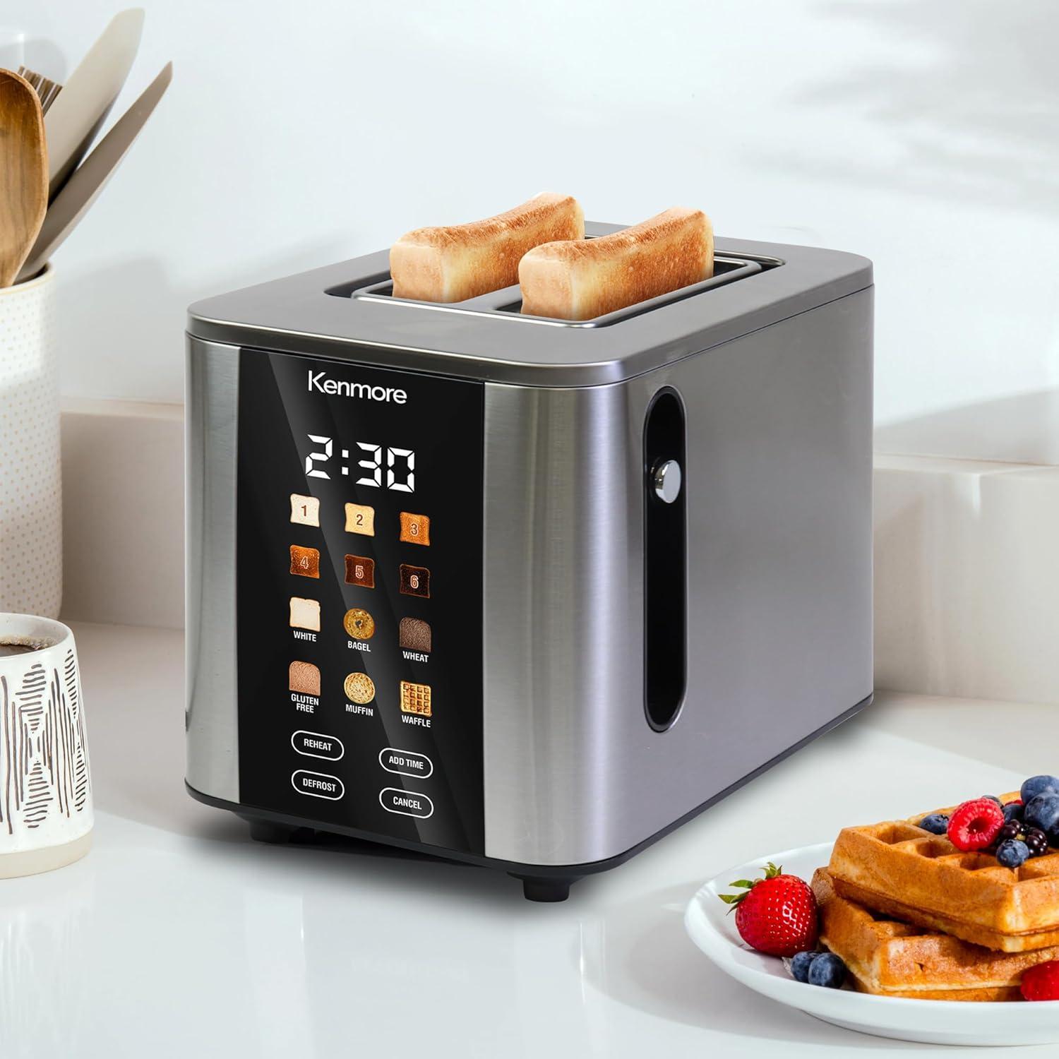 FULL COLOR TOUCH SCREEN: Kenmore's 900W digital toaster features intuitive graphic-based touch controls with full-color images for shade settings and bread types and a bright LED timer display.