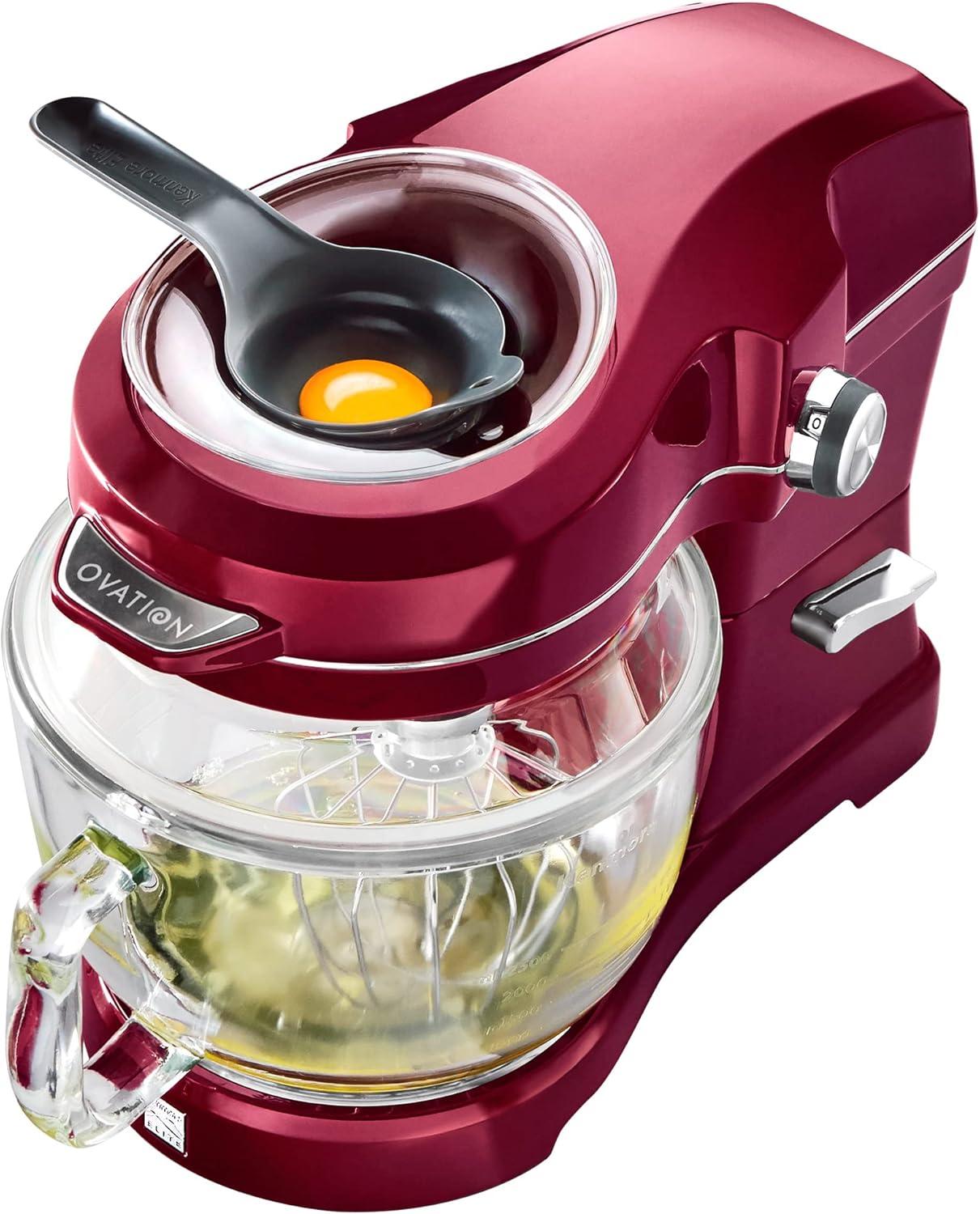 EXCLUSIVE ACCESSORIES – the kenmore ovation stand mixer comes with interchangeable flat beater, dough maker hook, and wire whisk. it also includes a 5 qt glass bowl with a storage lid, wide-mouth funnel, egg separator, and ingredient grater/zester designed to fit the ovation's pour-in opening. these accessories enhance the mixer's functionality and versatility.