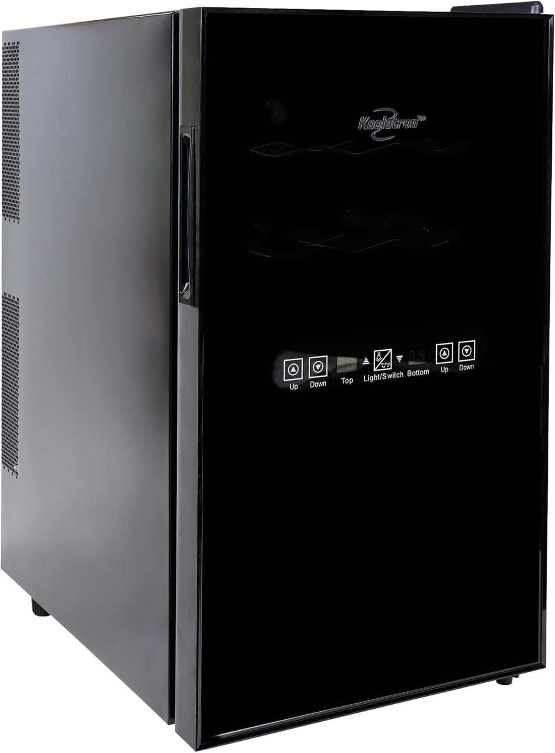 Experts recommend storing wines at higher temperatures than your typical refrigerator provides, especially for long-term storage. The Koolatron Dual Zone 18 bottle unit helps you get the most out of your collection with separately controlled cooling zones for your red, white and sparkling wines. This freestanding wine fridge can keep up to 9 bottles in each zone with removable wire racks that let you customize the interior to accommodate larger or irregularly shaped bottles. The stylish mirrored glass door protects your wine from damaging UV rays while soft interior lighting subtly displays your favorite vintages. Advanced thermoelectric technology cools efficiently with no noise or vibrations, keeping your wine at a consistent, ready-to-serve temperature with the sediment undisturbed. Now you'll have lots of room in your fridge for cheese and canapes!