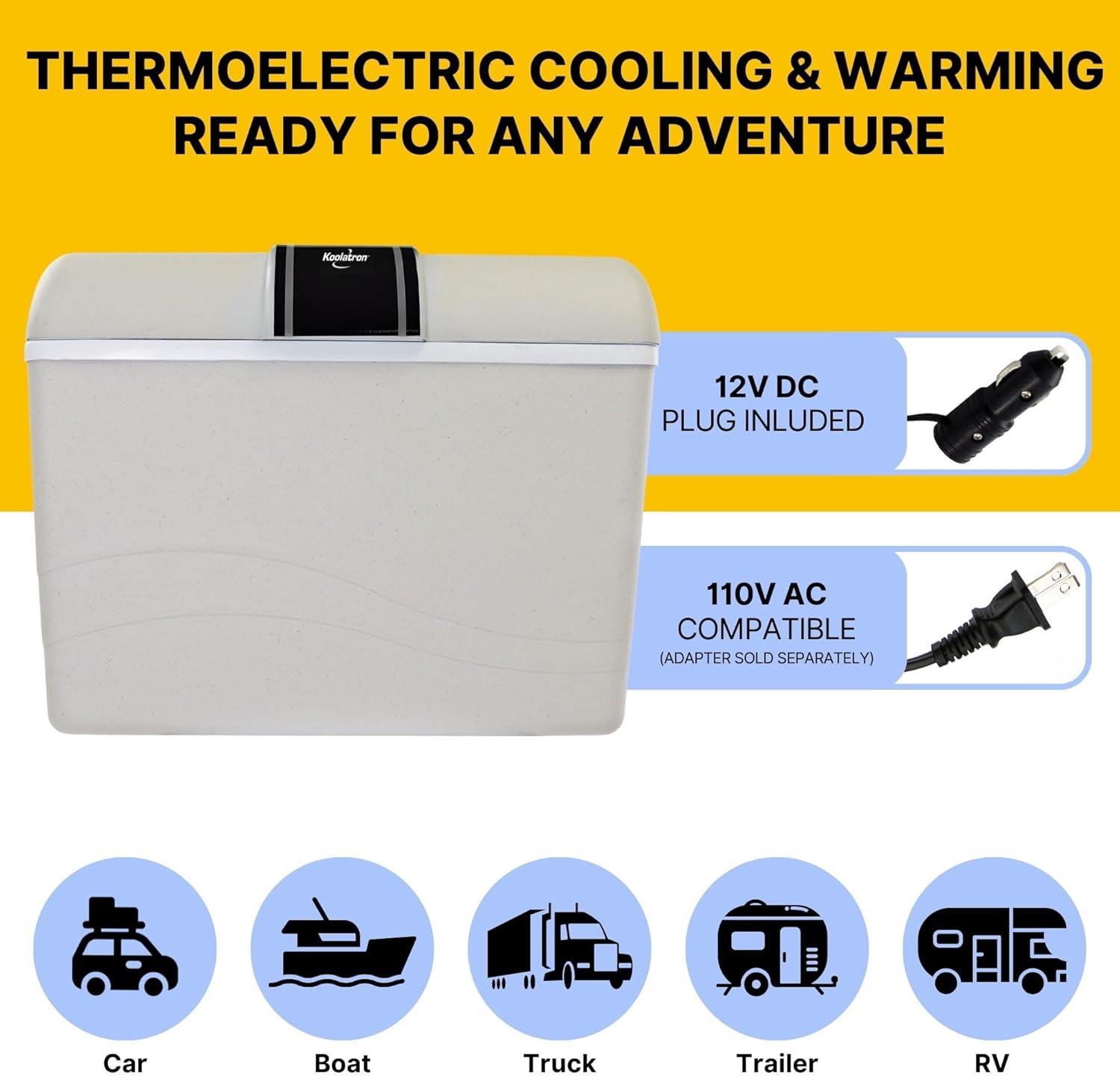 Plugs Into Any 12V Outlet: This thermoelectric cooler/warmer comes equipped with a 12V DC adapter, allowing you to use it in your car, truck, or boat. It is also compatible with AC power (110V adapter sold separately) for indoor use, providing flexibility for various environments.