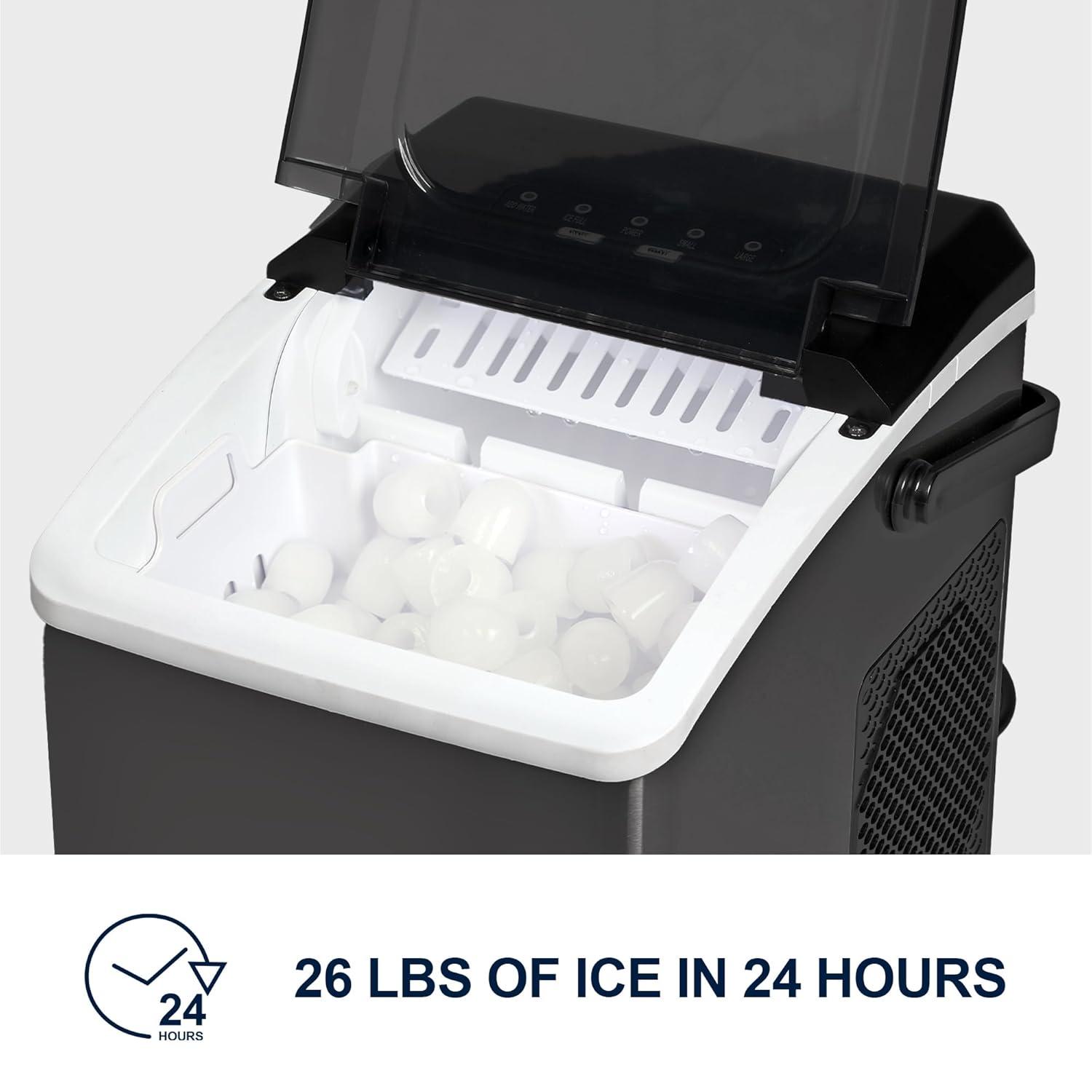 1.3 LITER CAPACITY WATER TANK – With a 1.3 liter capacity reservoir, the sleek black stainless steel Koolatron Ice Maker can produce 26 lbs (11.7 kg) of ice per day. Its compact size still fits easily on your countertop, making it efficient and space-saving.
