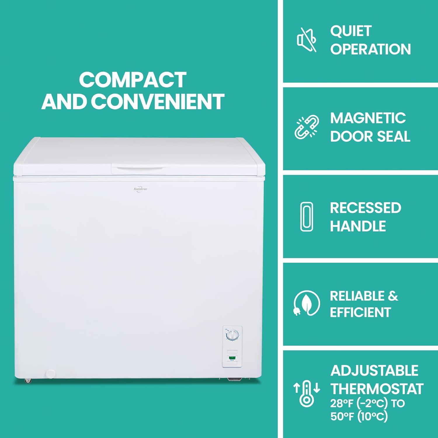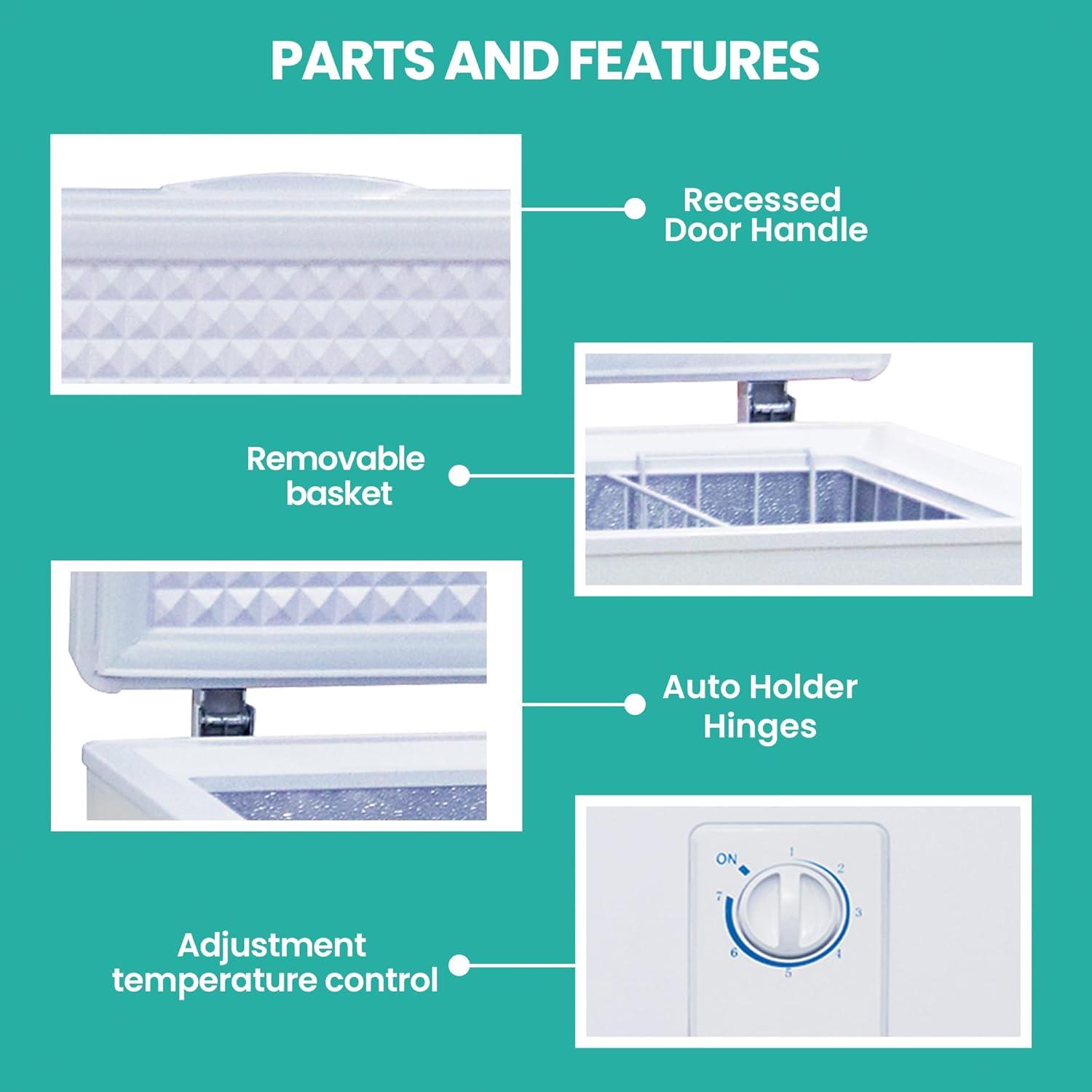 CONVENIENT STAY-OPEN LID: The freezer lid opens effortlessly with one hand & remains open as long as needed. Rear-mounted hinges prevent the lid from hitting the wall & ensure a tight seal when closed, making it easy to load and unload your freezer. This feature adds convenience and safety, allowing you to manage your frozen goods with ease.