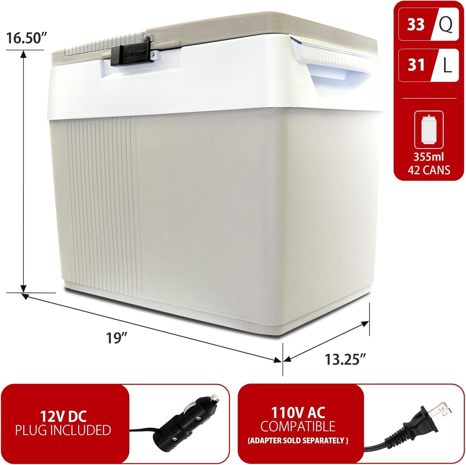 31 L (33 QT) PORTABLE COOLER – With a 31 liter (33 quart) capacity that can fit 42 standard soft drink cans, this 12V powered cooler/warmer has plenty of room for all your needs. Whether you're packing drinks for a party or food for a camping trip, this cooler has ample space to accommodate everything.