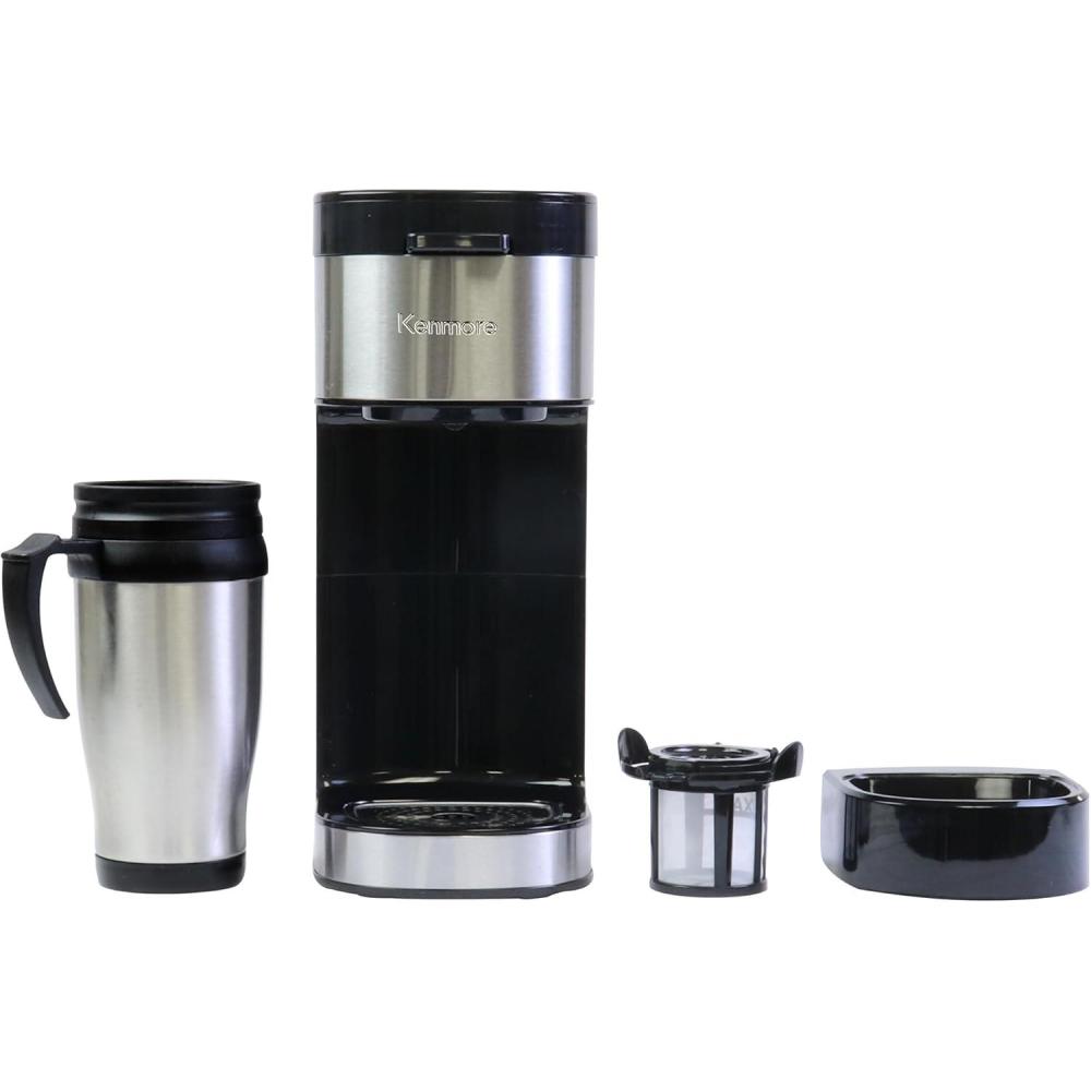 imageKoolatron Kenmore Single Serve Coffee Maker ampamp Stainless Steel Travel Mug CapsulePod ampamp Ground Coffee Brewing K Cup Compatible Hot ampamp Iced Coffee Machine 6 to 14 Oz Brew Sizes Auto ShutOff Black