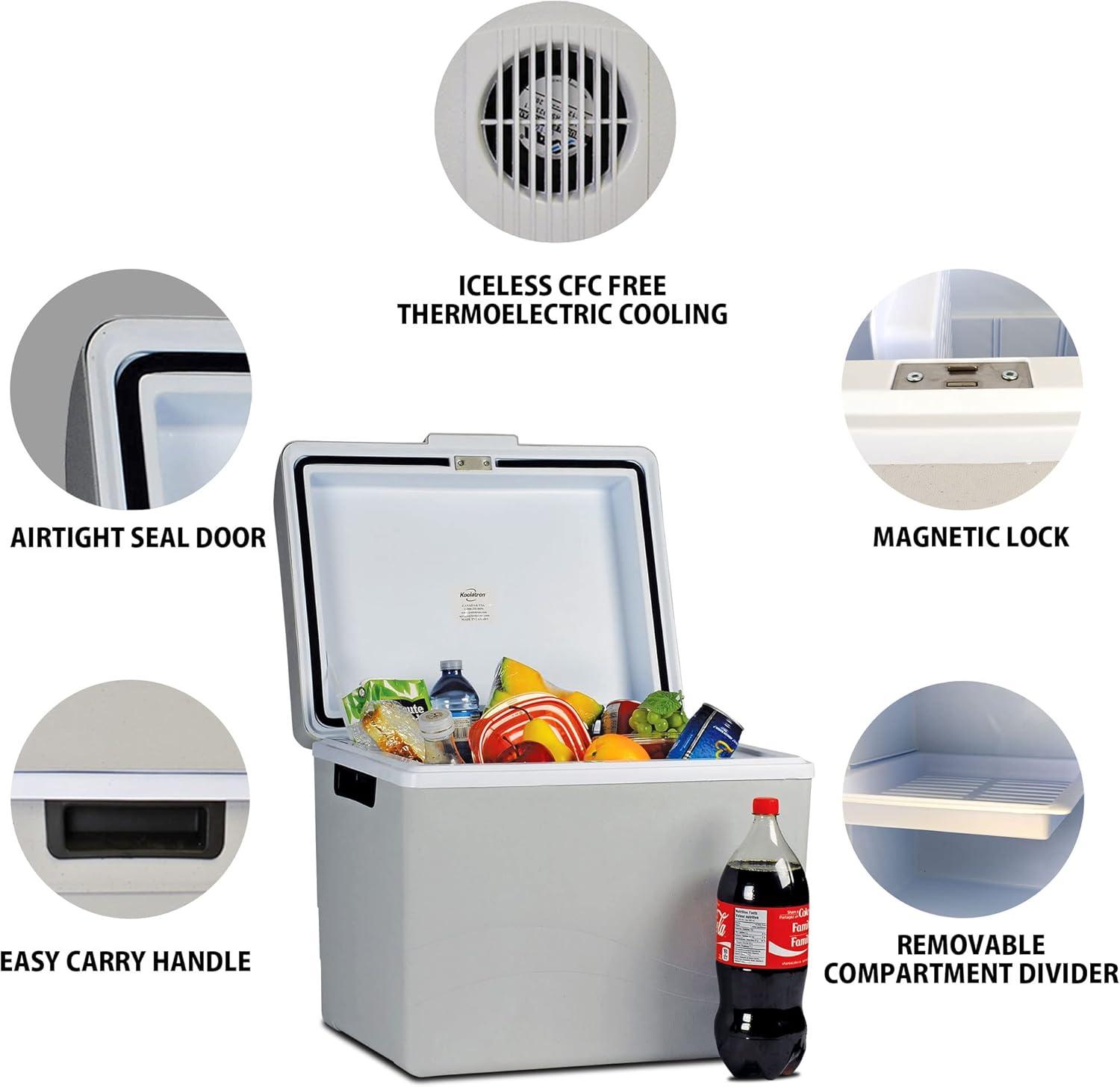 The Koolatron Cooler/Warmer was invented over 30 years ago but even today, is a well-kept secret. It replaces traditional ice chests with technology that is even more sophisticated than your home refrigerator, and far better suited for travel. It's ideal for road trips, camping excursions, boating, tailgate parties, and just about any other away-from-home activity–or at home or dorm as a fridge or a warmer. Koolatron thermoelectric coolers keep your food and beverages cool without requiring you to stock up on ice every few hours. It plugs directly into your car's 12-volt power outlet, or into an optional 110VAC adapter (sold separately), where it draws less power than your car's parking light. Once plugged in, the cooler's solid state thermoelectric cooling module–which takes up less space than a 1.5” x 1.5” matchbook–will cool the contents by approximately 40 degrees F lower than the temperature of the surrounding air. For example, at a temperature of 80 degrees F the contents of the cooler will stay at 40 degrees F. As a result, you can store cool drinks for extended trips, preserve leftovers, and even keep ice cubes whole for three or four days longer than traditional coolers. No more costly stops for soda or snacks, saving you both time and money while on the road.