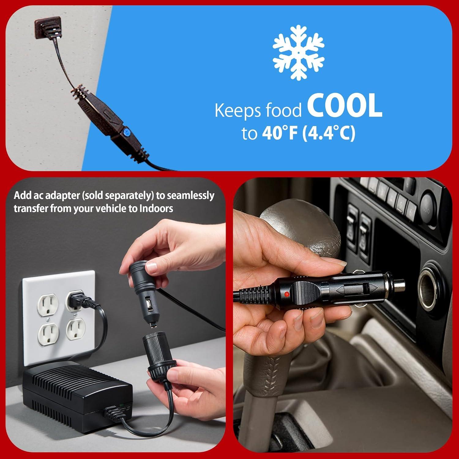 PLUGS INTO ANY 12V OUTLET: This convenient travel cooler/warmer comes with a 12V DC (5 Amps/60 Watts) power cord to plug into your car, truck, or boat. It is also compatible with AC power (110V adapter sold separately) for indoor use, providing flexibility for any situation.