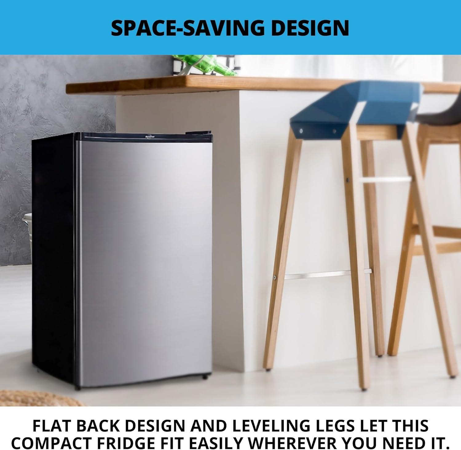 SPACE-SAVING FLAT-BACK DESIGN: the recessed door handle & enclosed compressor coils allow this compact fridge to fit easily wherever you need it, with no wasted space. its flat-back design ensures it can be placed flush against walls, maximizing your available space & providing a clean, streamlined look that enhances any room.