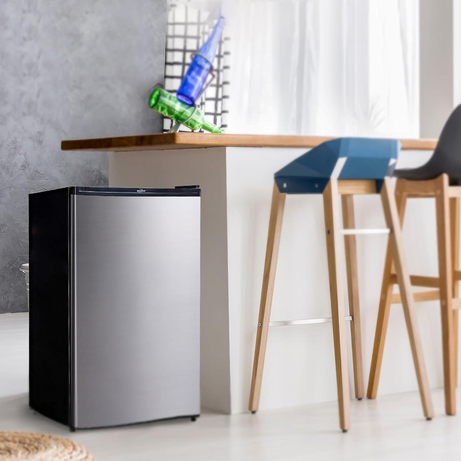 FREEZER COMPARTMENT: the half-width freezer compartment offers convenient storage for ice cube trays or frozen meals, with an included drip/defrost tray for easy cleaning & defrosting. keep your frozen items organized & easily accessible without taking up too much space, making it a practical addition to your kitchen or any other space.