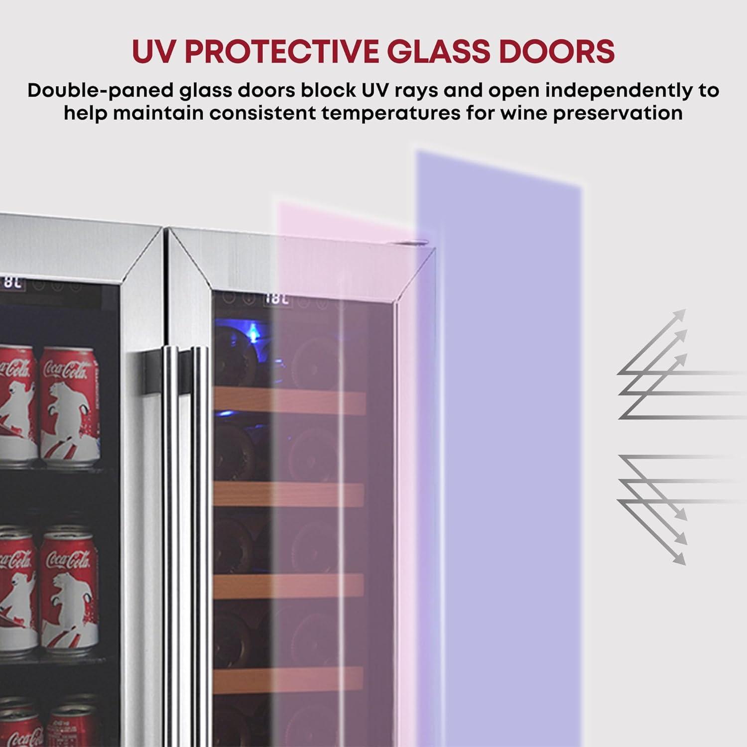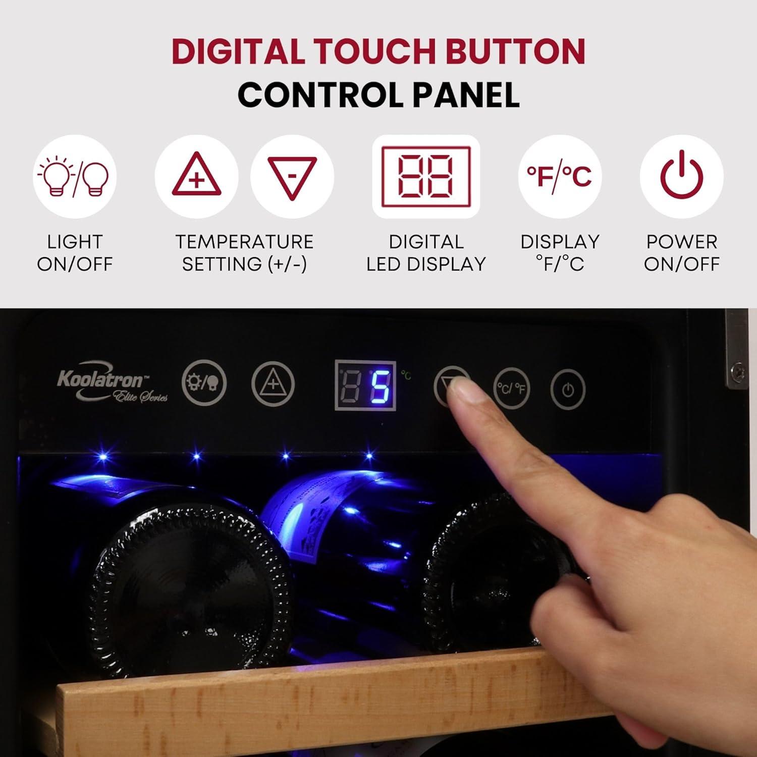TWO INDEPENDENT COOLING ZONES FOR WINE & BEVERAGES – The Koolatron 18 Bottle and 56 Can Dual Zone Wine Cooler offers two independent cooling zones, allowing you to customize the temperatures for up to 56 regular or tall beer or soft drink cans in the left chamber & 18 Bordeaux bottles in the right. With individual digital touch screen controls, it is perfect for both a beverage refrigerator & a wine cooler, catering to diverse storage needs, ensuring optimal conditions for all your drinks.