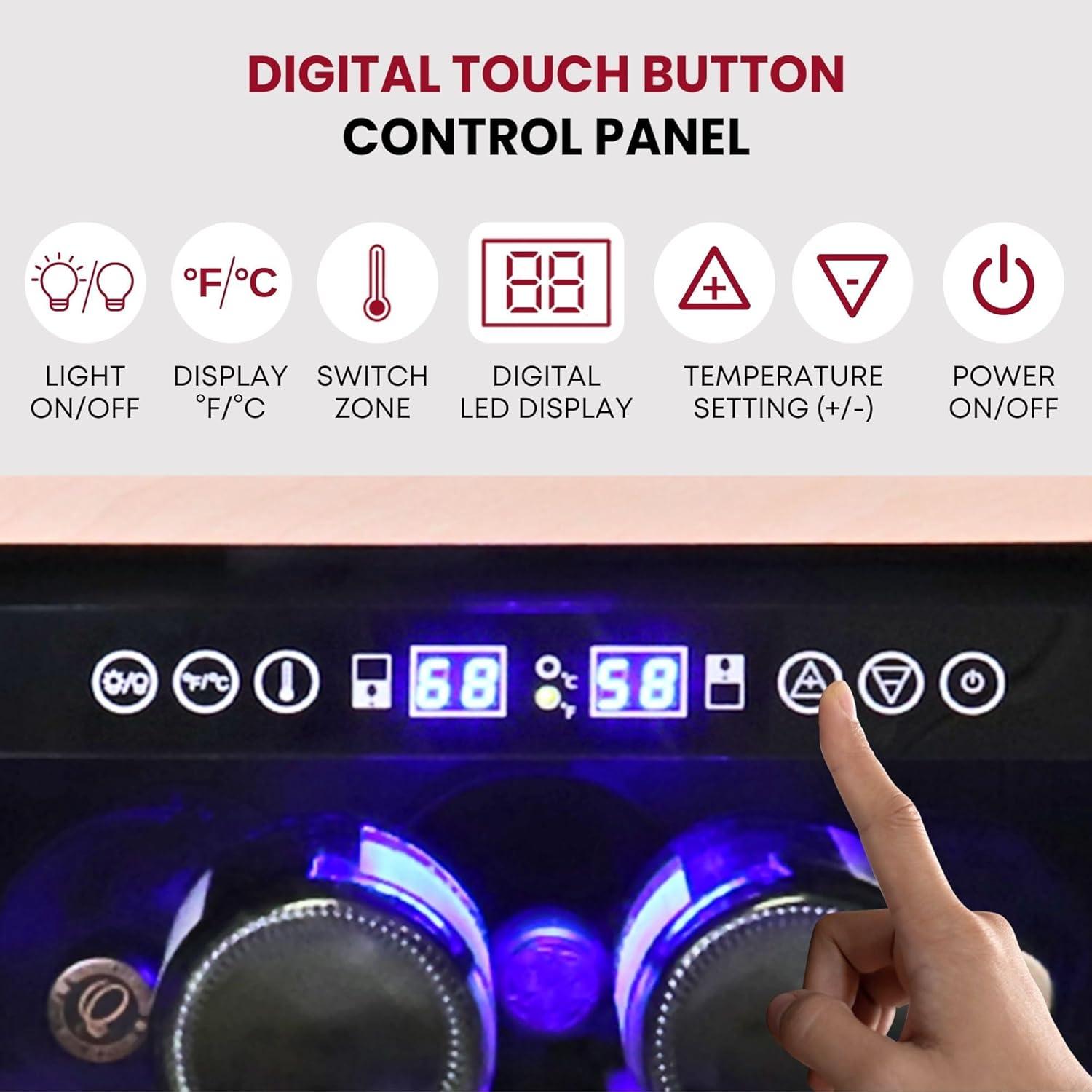 TOUCH SCREEN CONTROLS – The Koolatron 28 Bottle Dual Zone Wine Cooler has external controls & a digital display that let users view & adjust the temperature in each zone & turn the interior light on or off without opening the glass door. This convenience allows for easy management of the cooler's settings, ensuring that wines are kept at their desired temperatures without the need to open the door and disrupt the cooling process.