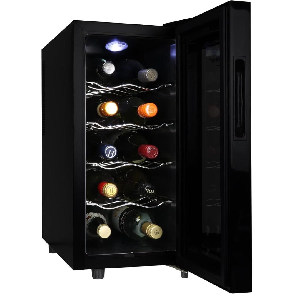 The Koolatron Wine Fridge provides elegant storage for up to 10 bottles with removable racks for customization. Its mirrored glass door offers UV protection, while thermoelectric cooling keeps wine at the ideal temperature without noise or vibrations.