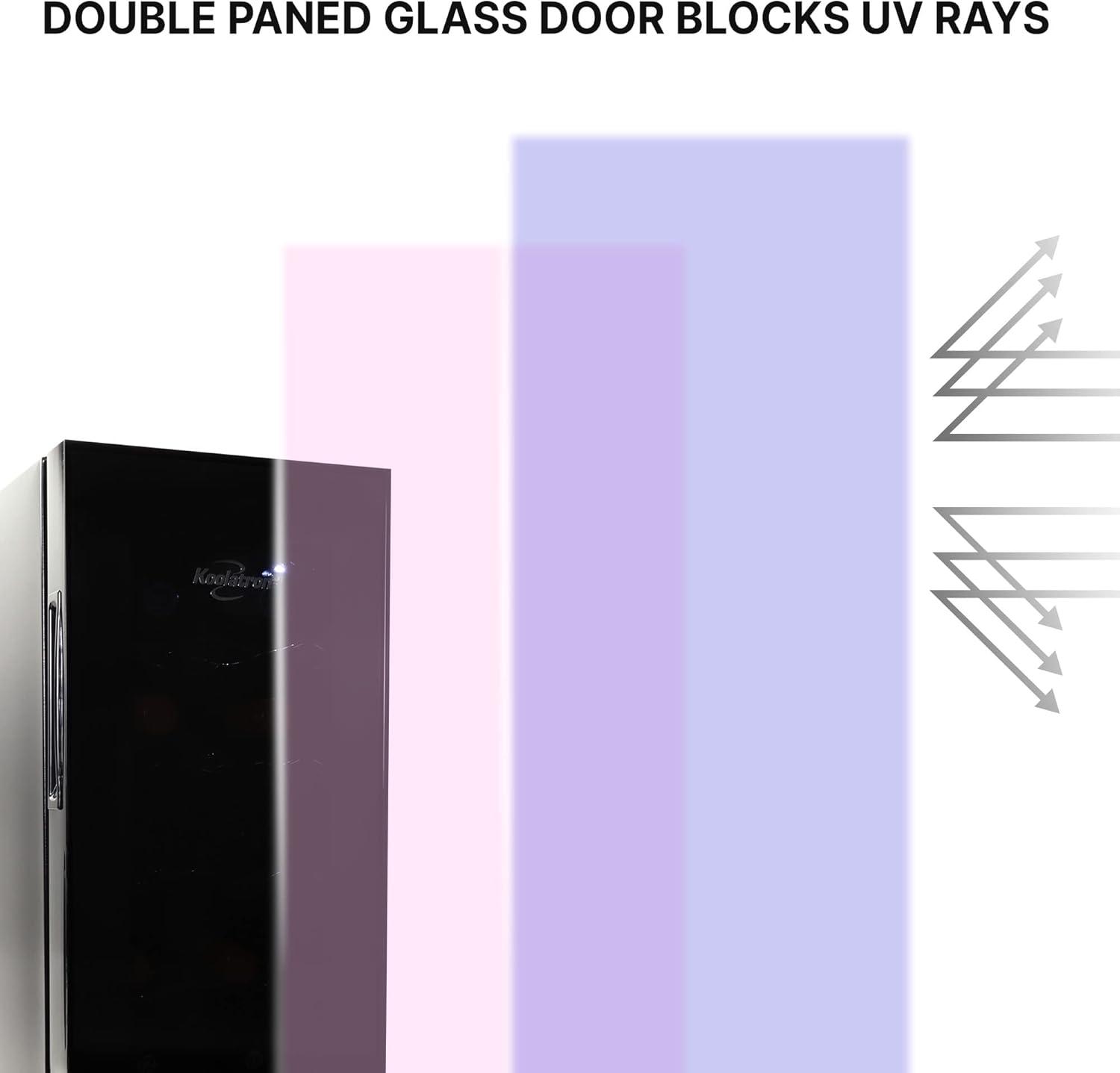 UV PROTECTIVE GLASS DOOR – The Koolatron wine refrigerator's double-paned mirrored glass door protects your wine from harmful UV rays, while the soft interior lighting subtly highlights your wine collection. This feature ensures that your wines are stored in optimal conditions, preserving their quality and flavor. The UV protection also adds an extra layer of security, keeping your wine safe from external elements.