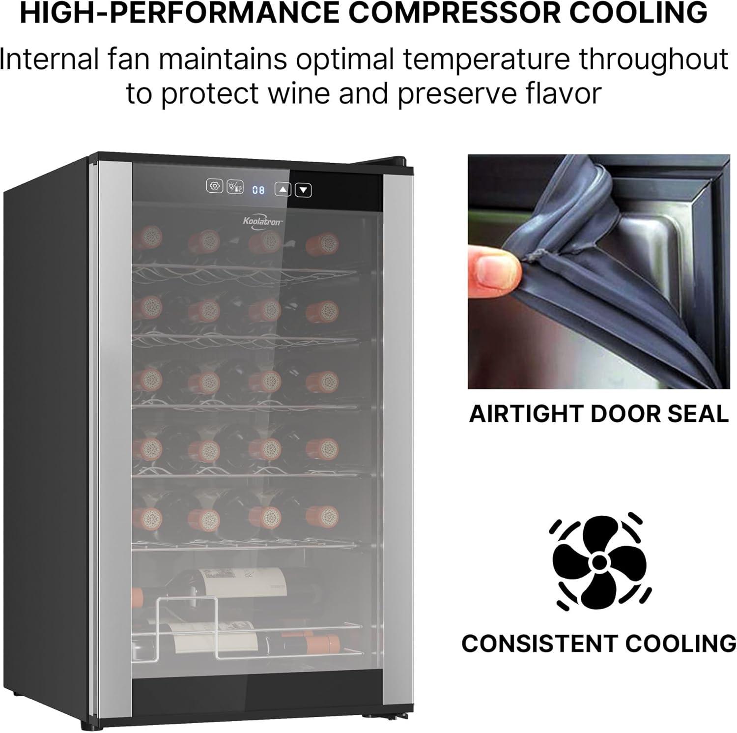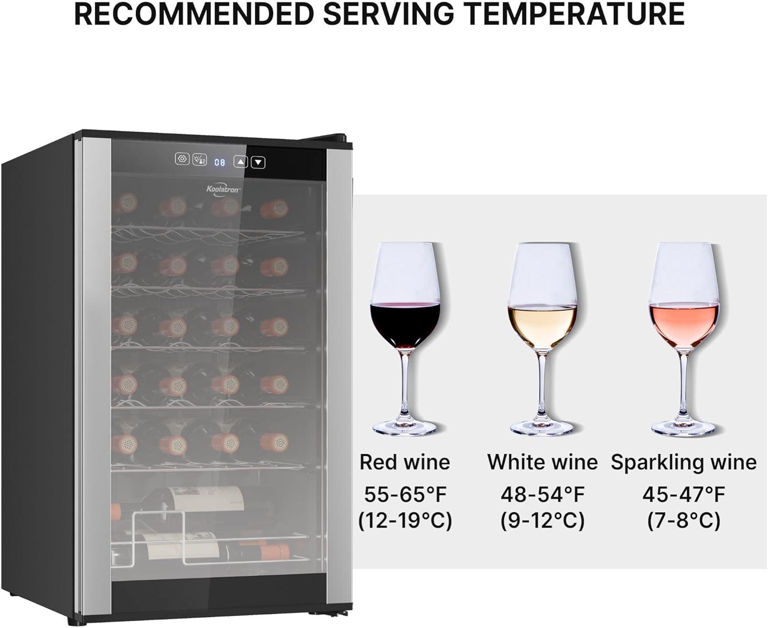 DUAL TEMPERATURE ZONES – The Koolatron wine cooler features two separate zones for storing different types of wine at their optimal temperatures. This allows users to store both red & white wines in the same cooler, each at their ideal serving temperature. The dual-zone capability ensures that wines are kept at the perfect temperature, enhancing their flavor and preserving their quality over time.