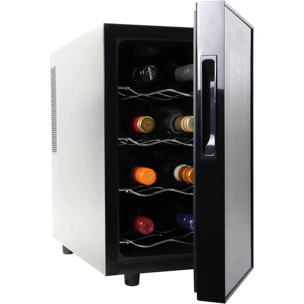 This temperature controlled wine fridge holds eight wine bottles, and features a silent and vibration-free thermoelectric cooling system. The removable shelves also let you customize the space to fit specialty bottles. The Koolatron Urban Series 8 bottle Wine Cellar brings together great style and design. Built-in soft lighting and stainless-steel trimmed glass doors make this wine fridge a perfect display piece in any kitchen, den, or home bar. The electronic temperature controls takes the guesswork out of storage, and make it simple to keep your wines at the perfect temperature and ready for pouring.