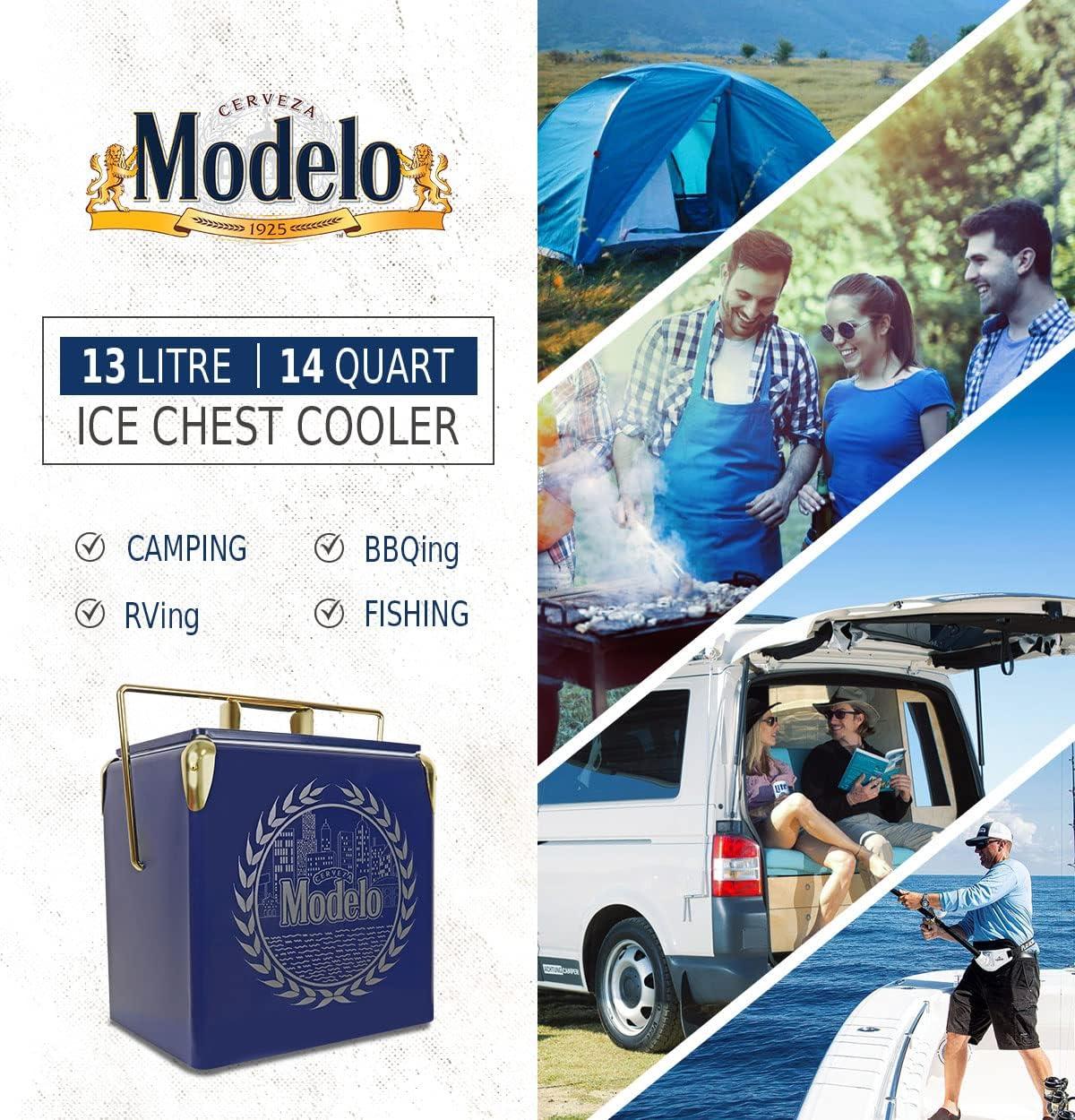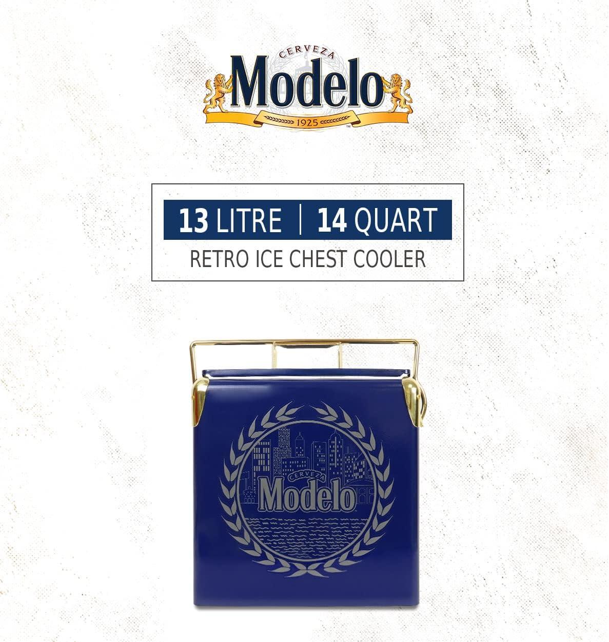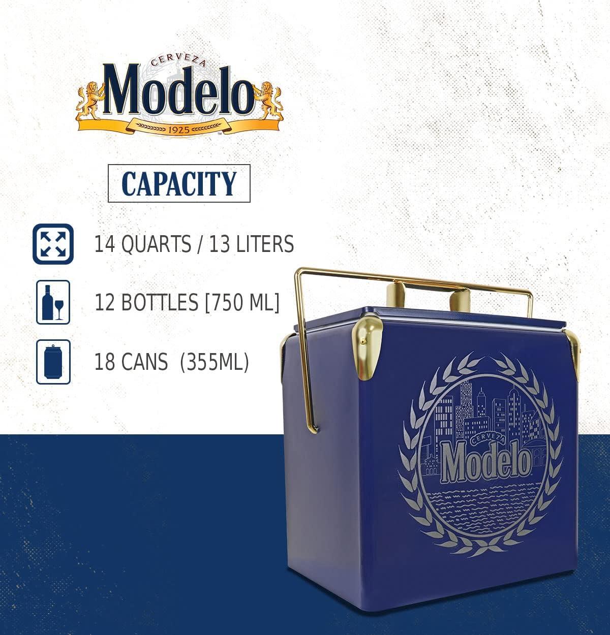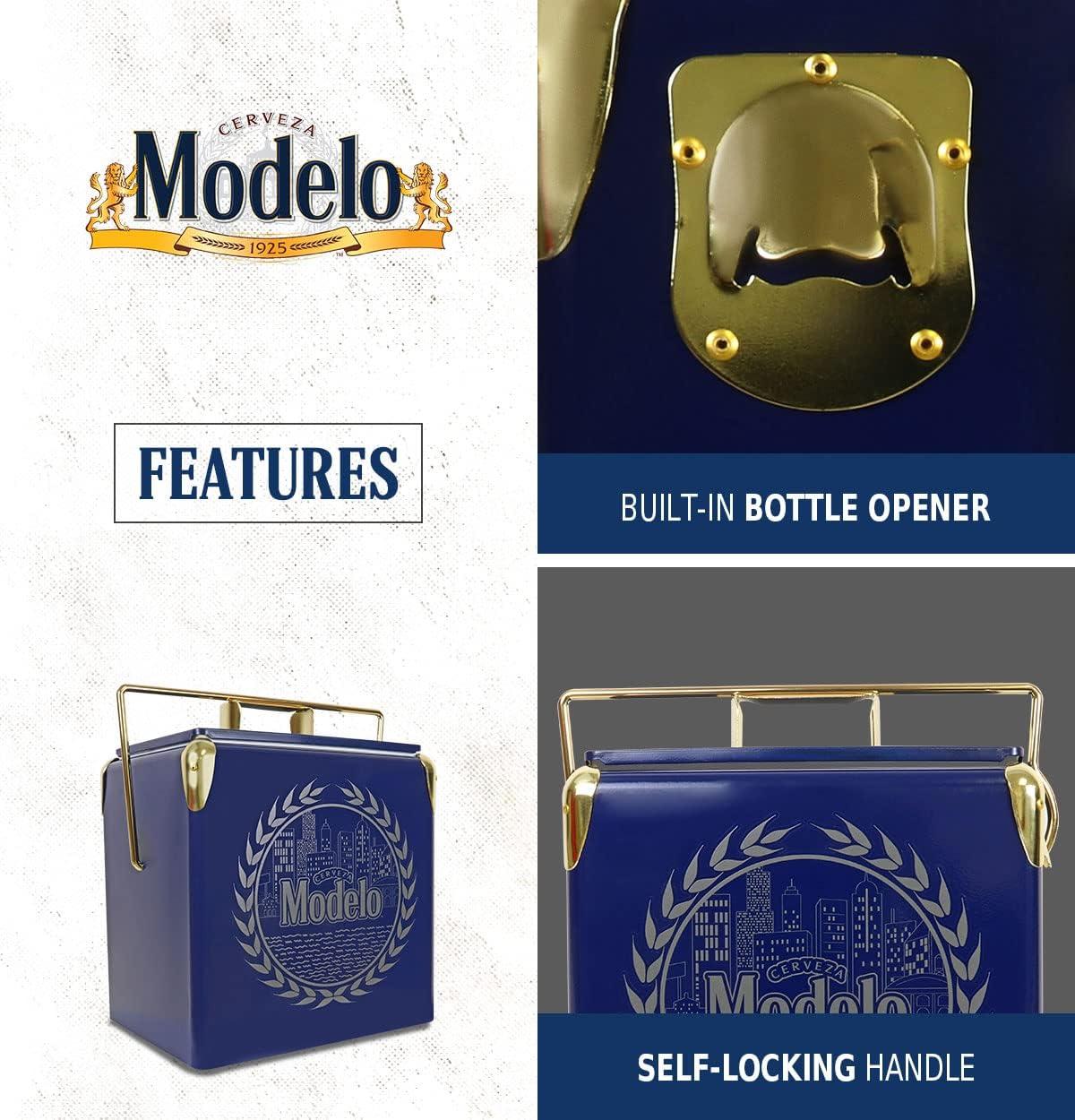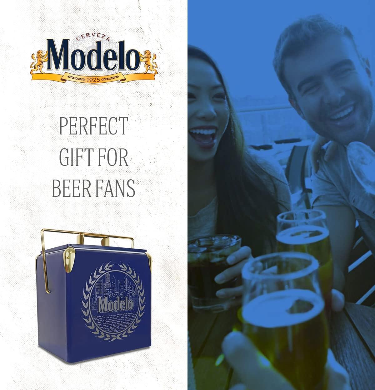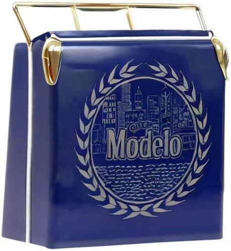 Perfect Gift for Modelo Fans: Unique retro-style cooler with eye-catching blue exterior, shiny gold-colored accents, and vintage Modelo artwork is the ideal gift for collectors and day-trippers