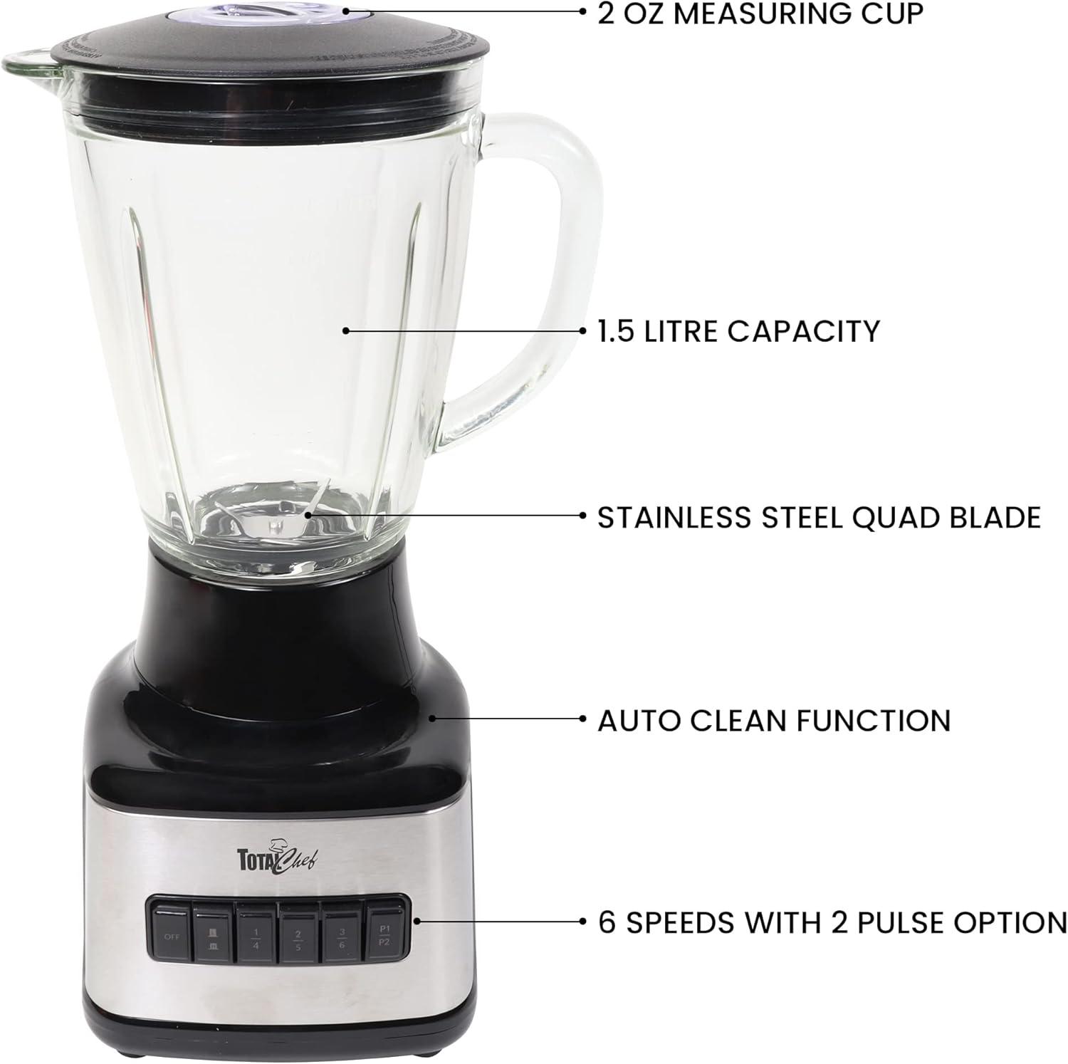 Total Chef Countertop Blender - Electric Mixer, Frozen Smoothie, Shakes, Milkshake, Puree Maker, Licuadora Grinder Kitchen Appliance With 6 Speed & Pulse Function, Dishwasher Safe Glass Pitcher, Black