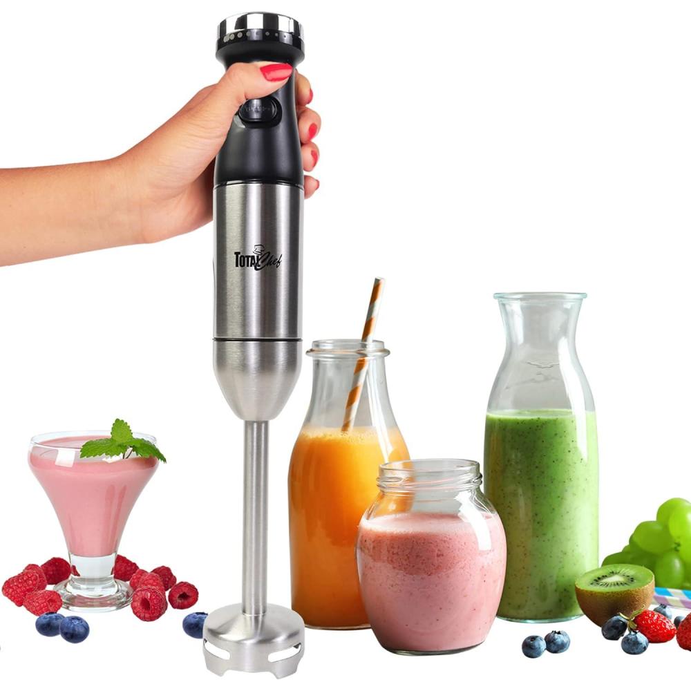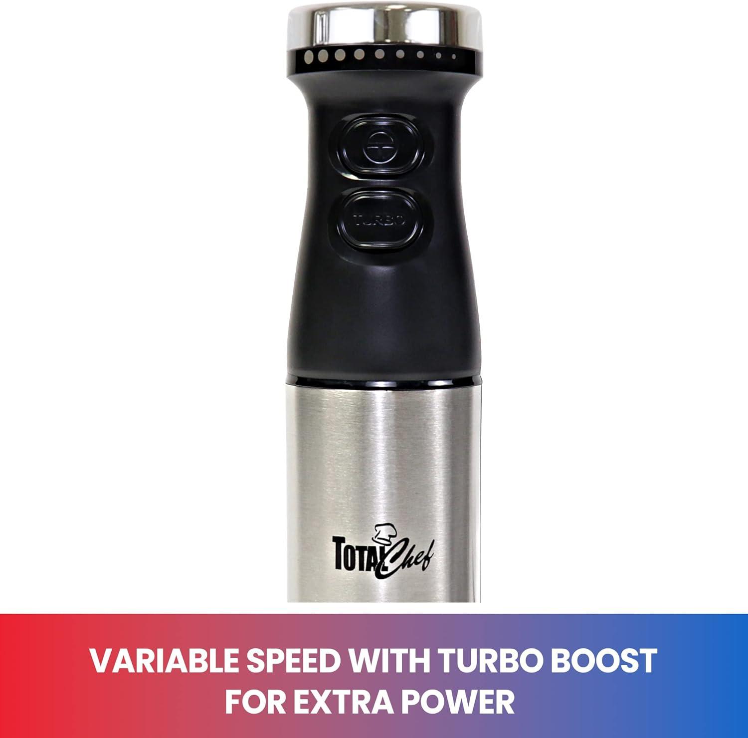 The Total Chef Variable Speed Hand Blender, with its 225W motor and heavy-duty double-edged stainless steel blades, makes it easy to create perfect purees. The Turbo Boost button provides an extra burst of power when needed. Blend smoothies or shakes right in the included beaker, which also comes with a lid for convenient storage. Plus, it's easy to clean and dishwasher safe.